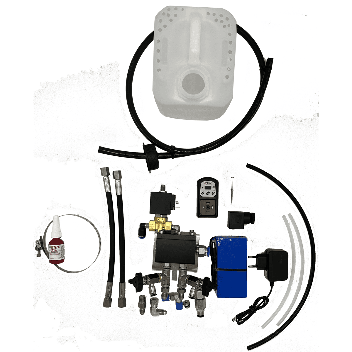 This comprehensive system includes pneumatic valves with piston and control membrane, two screw connections (6 x1/4 and 6S x1/8), two straight screw-in screws (6S x 1/8), a connection plug angle (8S x 1/8), and a 2/3 solenoid valve (12V 14W DC) with silencer (1/4″). An electronic timer ensures precise control, while pre-bent stainless steel pipes connect the two separators seamlessly. The system also features a control pressure hose, GEKO quick coupling with a 1/2″ low-pressure hose (50 cm), and a robust 5-liter condensate collection container with ventilation.